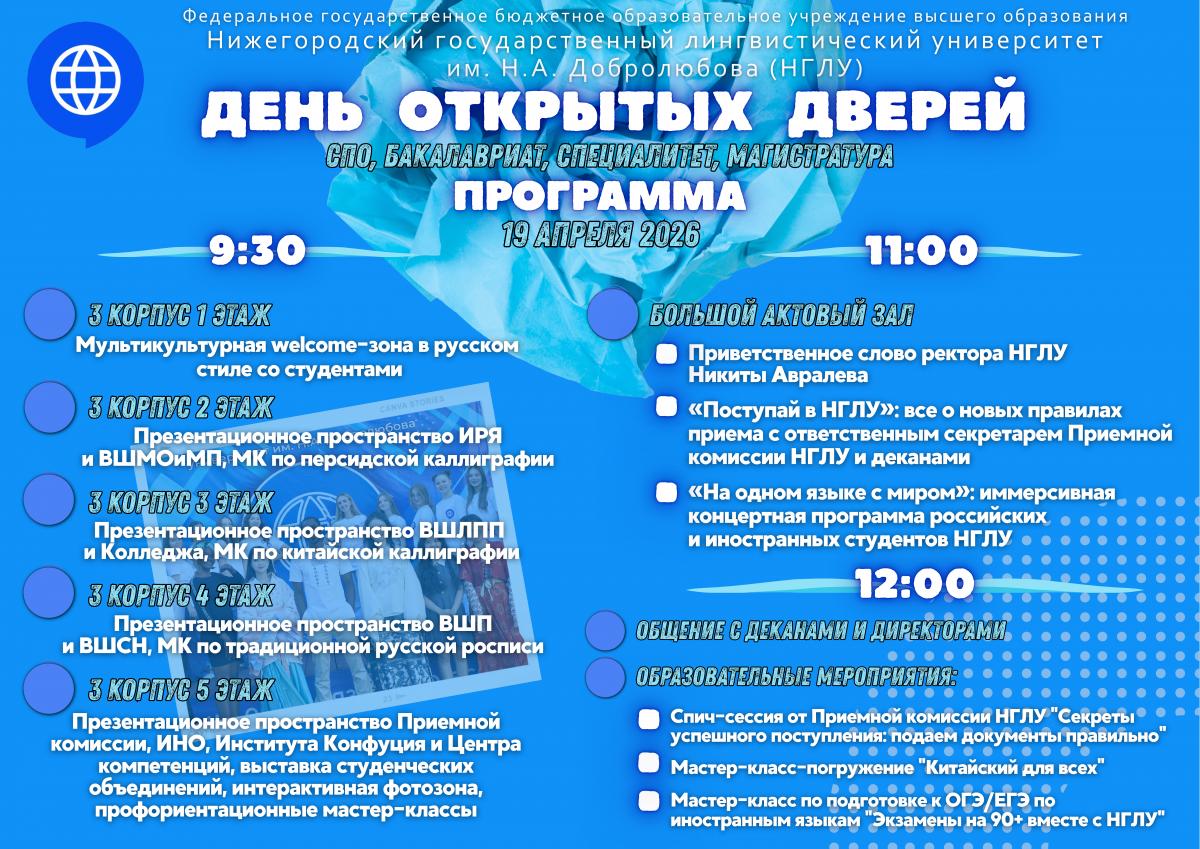 19 апреля 2026 года Нижегородский государственный лингвистический университет им. Н. А. Добролюбова проводит День открытых дверей и приглашает абитуриентов и их родителей познакомиться с университетом ближе. Мероприятие приурочено к Году единства народов России и позволит гостям увидеть, как формируется многокультурная образовательная среда, где ценят разнообразие языков и культур и раскрывают потенциал каждого студента.